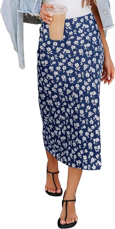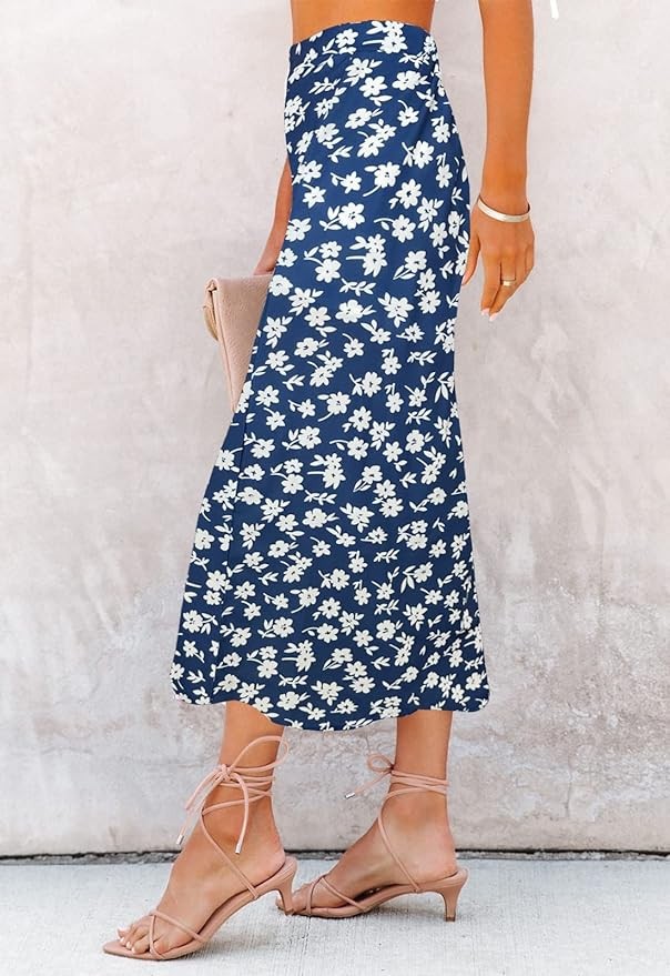 HERBATOMIA Women’s Floral Print Midi Skirt Casual High Elastic Waist Zipper Vintage Long Boho Skirts for Women