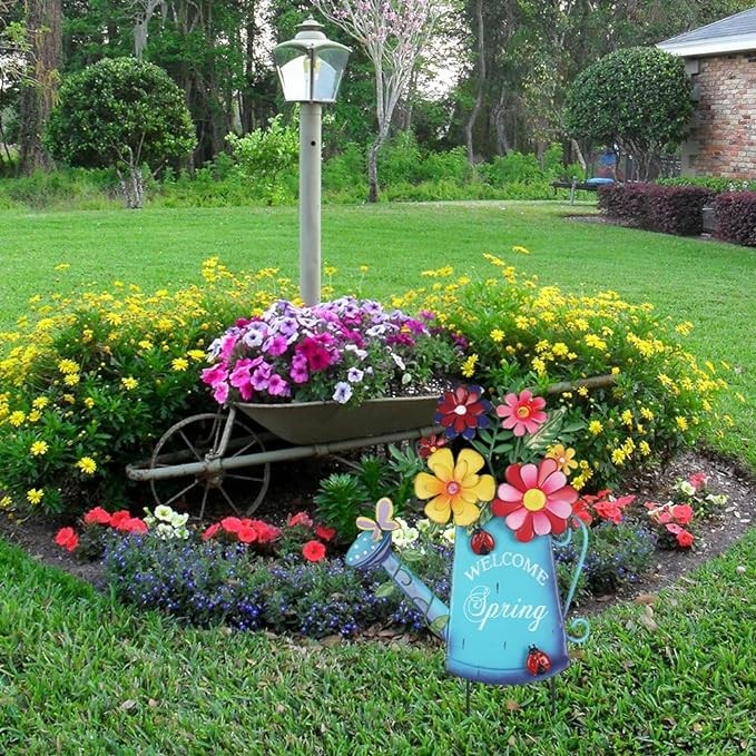 hogardeck Garden Decor for Outside, Metal Watering Can Decorative Garden Stakes with Flowers, Yard Art Welcome Spring Signs for Outdoor Lawn Backyard Porch Patio Garden Decorations