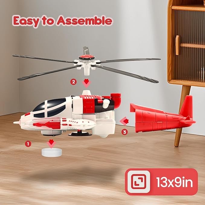 • Automatic Demonstration Function: With just a press of a button, the helicopter toy automatic deformation, performs a 360-degree rotation, displays colorful lights, and plays dynamic music, going around the room and creating an engaging and interactive playtime experience, which will leave children spellbound.(Attention:The universal wheel cover on the bottom of the airplane needs to be removed for use.)