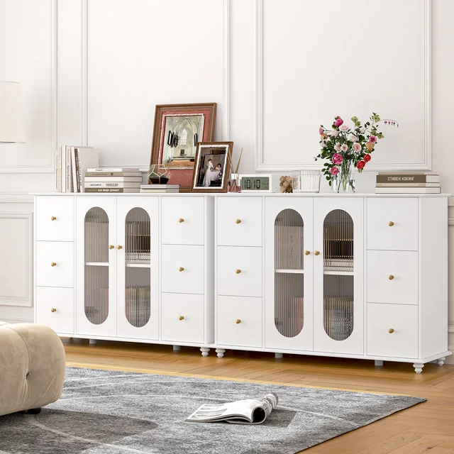 This 6 Drawer Accent Storage Cabinet with Glass Doors is styled in an elegant white color, with fluted glass and gold knob handles adding a sophisticated touch of luxury. It will definitely become one of the most attractive pieces of furniture in your home. The smooth painted finish makes this modern sideboard easier to clean.