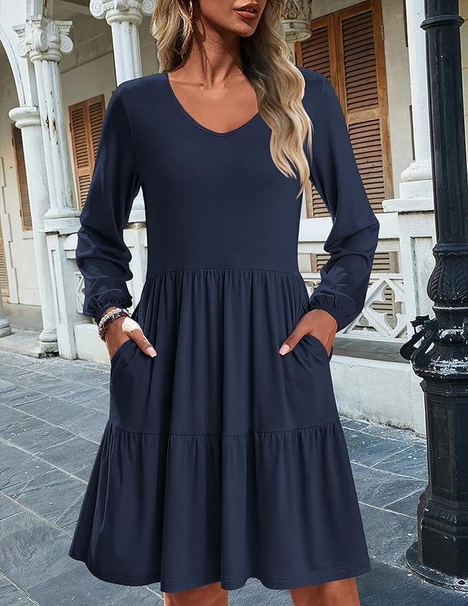【Unique Design】 Long Sleeve Tiered Dress with Pockets/Sexy V Neck/ Ruffled A-Line Dress/ Summer T-Shirts Dress with Pockets/Casual Swing Dress/Solid Sundress/Knee Length Dress/Empire Waist Dress/Fit and Flare Mini Dress.