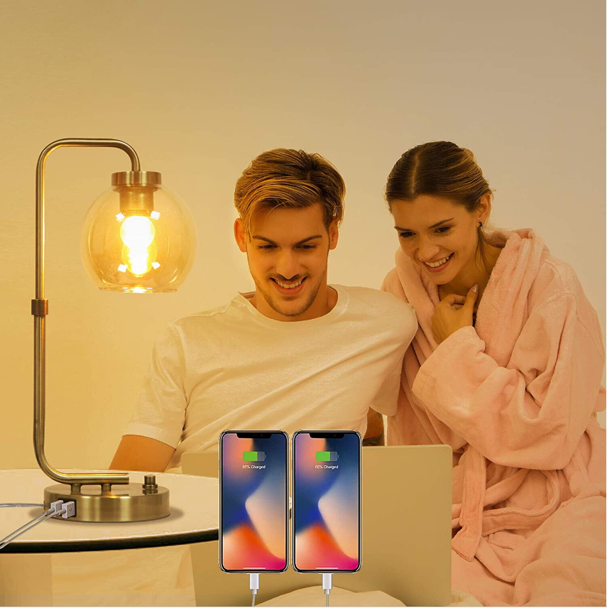 Jiosxc Industrial Table Lamp with 2 USB Ports, stepless dimmable Lamp, Dimmable Bedside Reading Lamp, Brass Metal Desk Lamp with E26 Edison LED Bulb Glass Shade for Bedroom Living Room Office