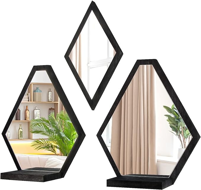 • [SOPHISTICATED DESIGN]- Set of 3 elegant geometric wall mounted floating decorative mirrors with black wooden frame is perfect for wall, hallways, office and any place that needs aesthetics and functionality.