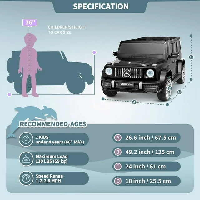 • Real 2-Seater & 12V Engine: Joywhale 12V Kids Ride on Licensed G63 has almost restored the real car's appearance, the luxurious and realistic appearance can give children an excellent driving experience. And equipped with large 2-seater & 12V dual motors power configuration, which can provide strong power on various terrains for two kids. The 20" extended seat can give kids more comfortable driving experience.