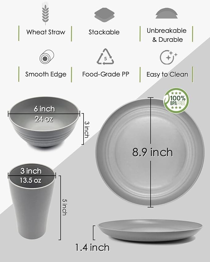 Package Includes - 12-Piece dinnerware set with 4 wheat straw dinner plates, 4 unbreakable bowls, and 4 unbreakable cups, service for 4. 100% refund or replacement guarantee, contact us if you have any problem.