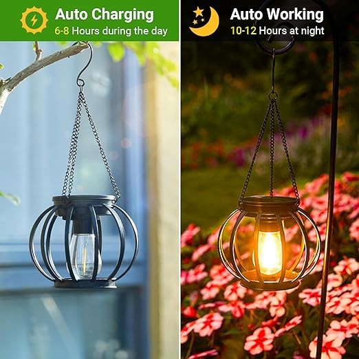 【Upgraded Solar Panel & Auto On/Off】Solar hanging lanterns outdoor have upgraded solar panel, it excels in capturing and transforming solar rays into a substantial power output. The solar lights automatically recharges in the sunlight during the day, and at night the outdoor solar lights automatically illuminates to provide extra-long illumination at night. For outdoor enthusiasts who adore twinkling lights but often forget to flip the switch, our outdoor solar lanterns waterproof offer the perfect solution.