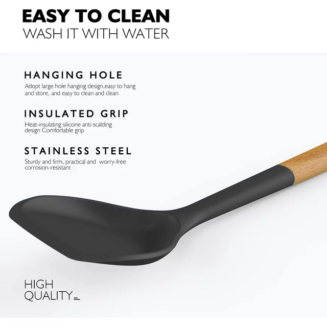 New kitchen utensils set design in 2022, what improvements have we made? Below is our collection of user feedback on all wood-handled cooking utensils on the Walmart platform 1: 43.2% of users complained that the wooden handle would crack during use Improvement: We used high quality solid logs and increased the size of the wooden handle by nearly 2 times 2: 20.81% of users complained that too many products in the set are like toys, small in size and rough in workmanship Improvement: We save the cost of extra products, we focus on improving product quality, we increase the overall size of the kitchen utensils, and thicken the silicone. We don't want to waste your money! 3: 10.3% of users feel that kitchen utensils have a strong smell Improvement: We require our suppliers to produce a test report for food grade silicone. We inspect each batch of silicone raw materials. Must be in full compliance with BPA FREE.