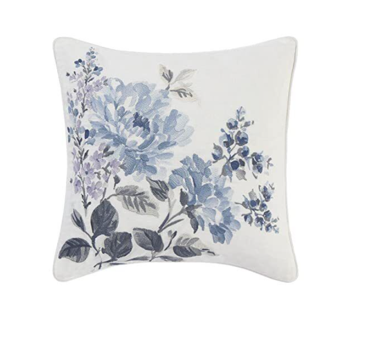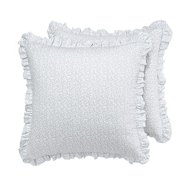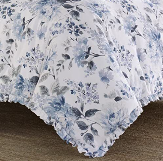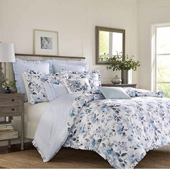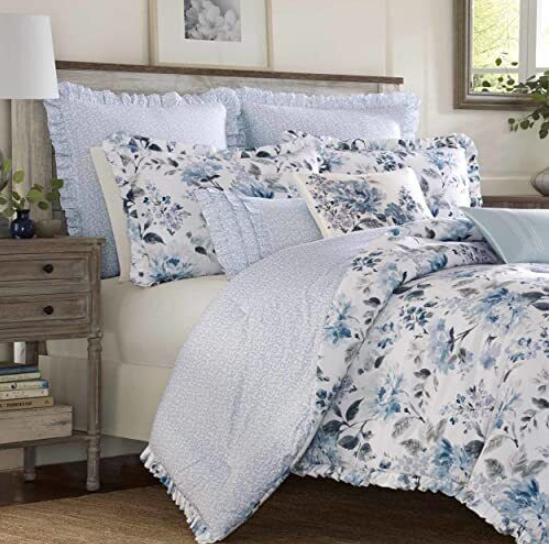 Garden inspiration brings natural beauty to any space, making Laura Ashley’s floral designs a perfect decorating choice. This beautiful blue and white watercolor print gives the classic garden floral a modern update with its relaxed painterly style and sophisticated grey accents. The ruffled comforter and shams are printed on a crisp white cotton pique weave, offering added textural interest and distinctive style. Embroidered and ruffled decorative accent pillows and coordinating ruffled European shams allow you to create a luxurious bedroom with a decorator’s touch.