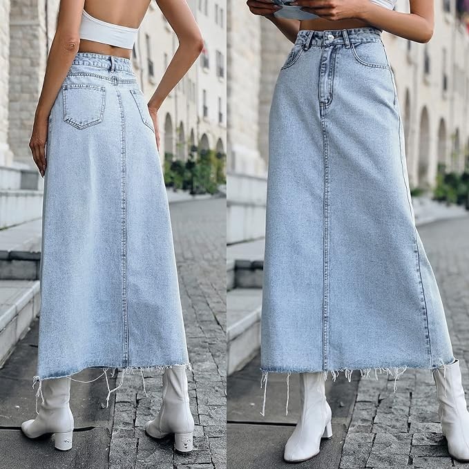 Features: High waist long denim skirt, fray raw hem, A-line jean skirts for women are very feminine, classic 5 pockets are designed for your convenience