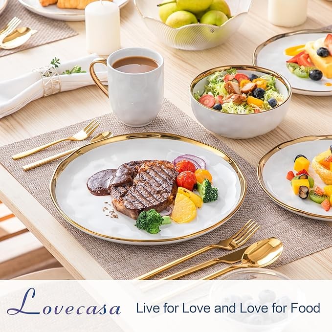 • 【HANDMADE AND MODERN DESIGN】Carefully crafted white stoneware. Inspired by stylish modern elements, the designer highlights the sophistication and elegance of white stoneware with a luxurious royal gold thread. This dinnerware set will give you a good appetite and a good mood