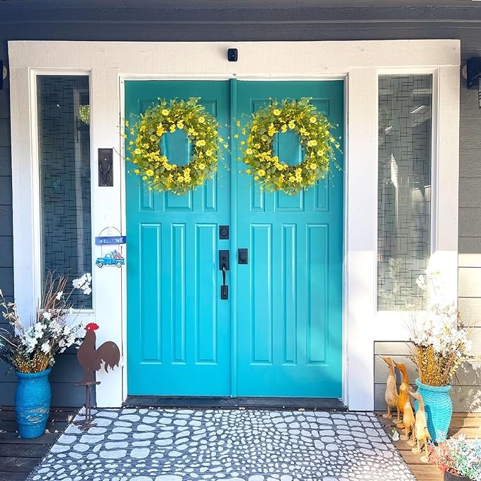 LVLFOR 24In Artificial Yellow Daisy Wreath, Spring Wreath with Green Eucalyptus Leaves, Yellow Flowers with Grapevine Wreath, Silk Floral Spring Summer Wreaths for Front Door Window Wall Porch Decor