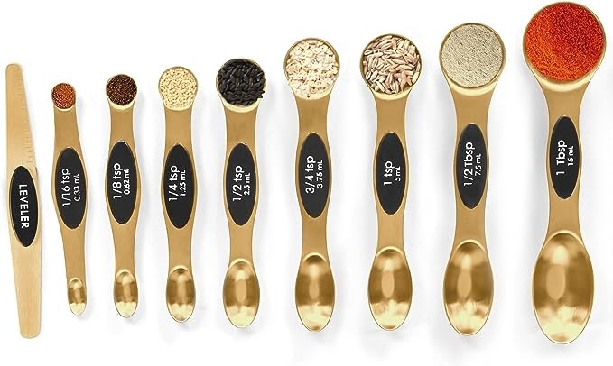 Dual Sided Spoons Set: Equipped with an oval-headed side design, if you have different spices and seasonings sets or measuring cups, it exactly fits in narrow jars and is desirable for scooping dry ingredients; the rounded head is more convenient for measuring liquid ingredients than liquid measuring cups. It's a practical cooking gadgets for women to use as well as any other kitchen accessories salad spinner.(Each measuring spoons set has the exact same measurement of its opposite side).