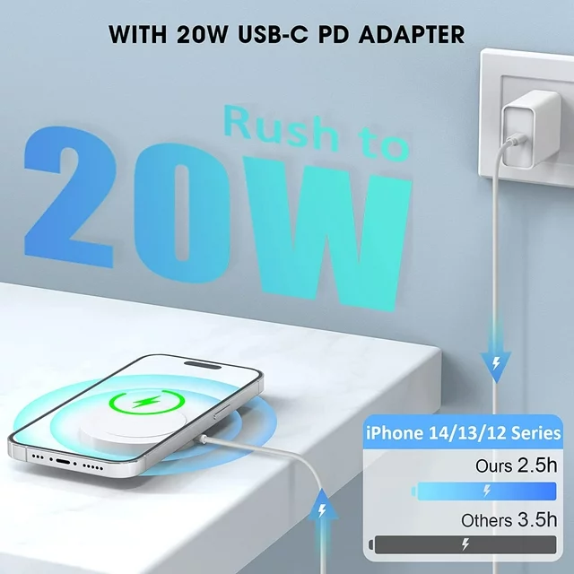 • A Type-C 20W PD adapter brings fast charging speed, fully charged only needs 2-2.5H, It's faster than that of the original 5W Compatible with iPhone charger, and the charging pad compatible with iPhone 15/ 14/13/12 series models, and other wireless devices(Compatible with iPhone 8-11series).