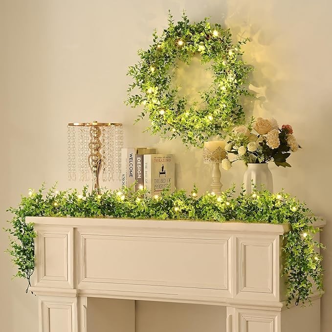 • PACKAGE & SIZE: This package comes with 2 pieces of artificial eucalyptus garlands and 2 LED light strings(total 13ft). Each faux eucalyptus garland is about 6ft / 1.8m in length. The loop at the end is convenient for installation and disassembly, so it is flexible and practical to meet different decoration needs.