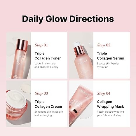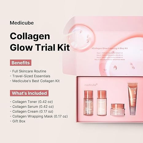 • ?Medicube's best-selling collagen glow skincare essentials? are formulated with triple collagen for plumping and glowing skin. Try our trial skincare routine featuring four different mini-sized products: Collagen Toner, Serum, Cream, and Night Wrapping Mask.