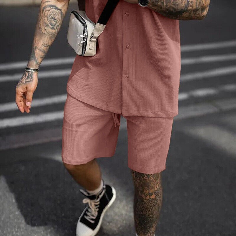 Mens Summer Outfit 2-Piece Set Short Sleeve Button Shirts and Shorts Sweatsuit