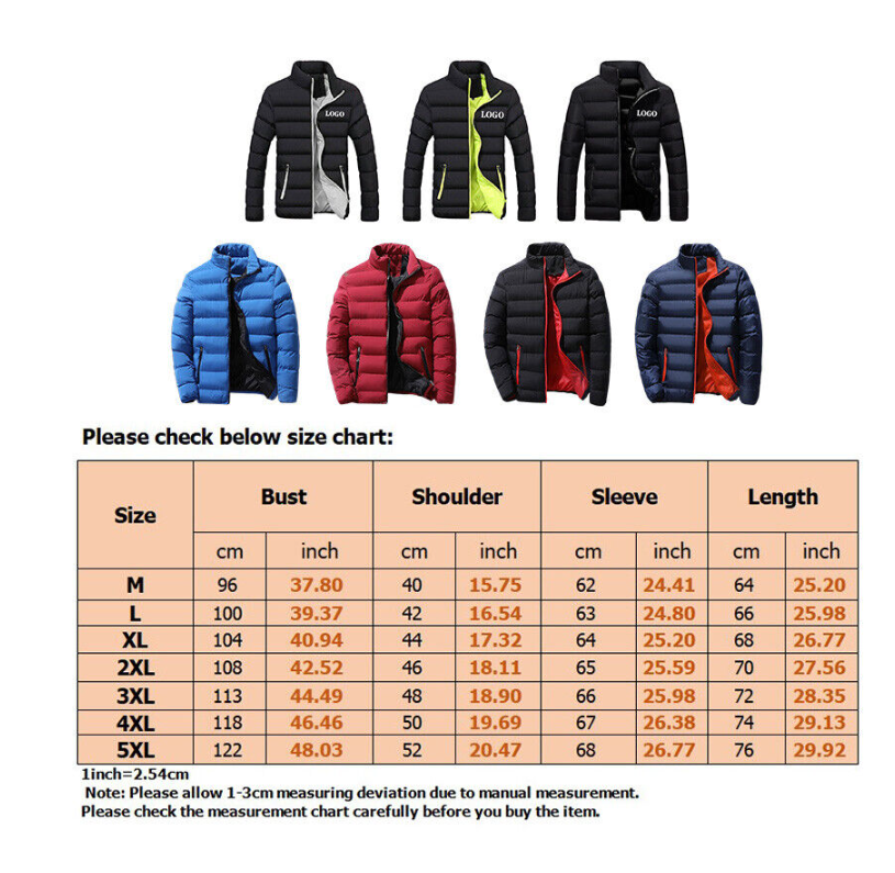 Mens Winter Warm Quilted Parka Down Jacket Padded Bubble Puffer Zipper Coats