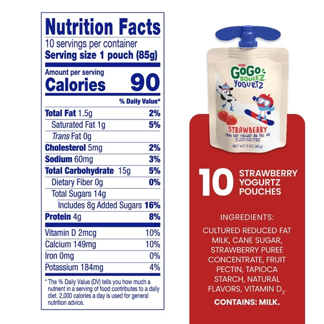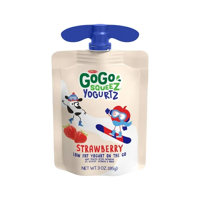 GoGo squeeZ yogurtZ are made with real low fat yogurt and strawberries, never anything artificial. Delivered in our iconic squeezable, portable snack pouches, GoGo squeeZ yogurtZ is safe to store at room temperature until opened. Our kitchen pantry friendly yogurt is a delicious snack with no preservatives and no fridge needed! Our fruit yogurt pouches are kosher certified, nut free and gluten free snacks, are made with no artificial growth hormones like rBST* and are a good source of Calcium and Vitamin D**.*Made with milk from cows not treated with hormones like rBST. No significant difference has been shown between milk from rBST-treated and non-rBST-treated cows.**At Least 10% Of The Daily Value Per 6 Oz