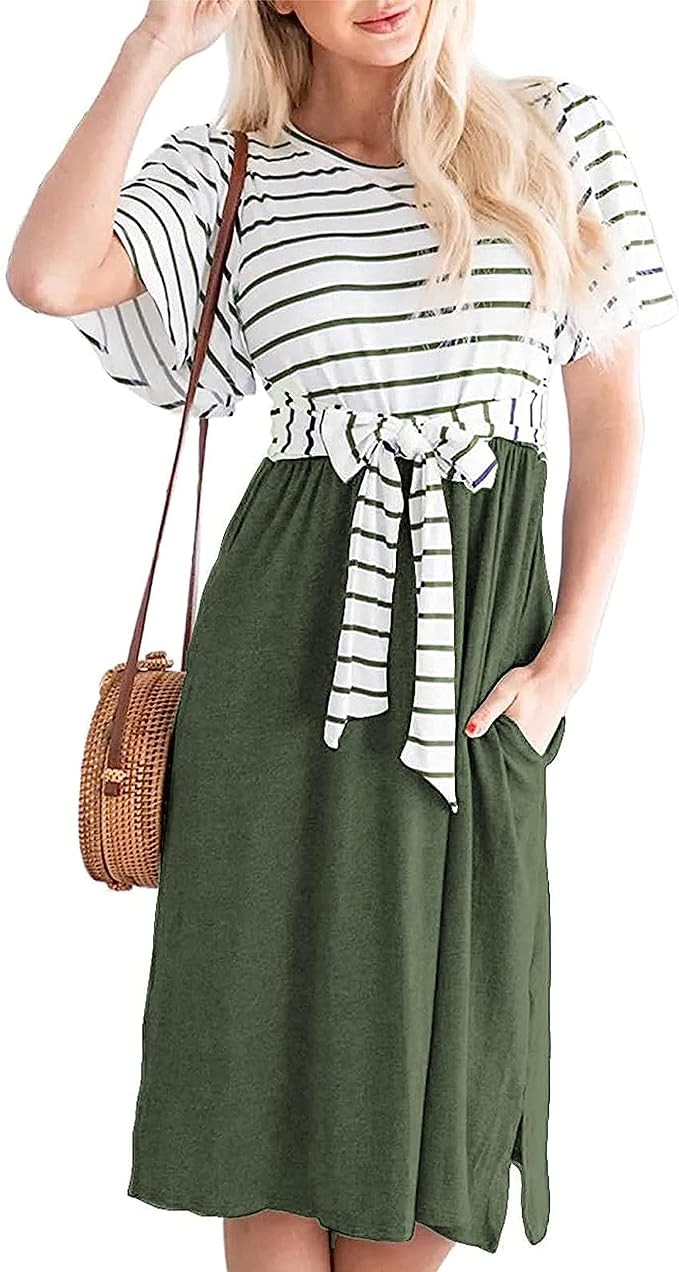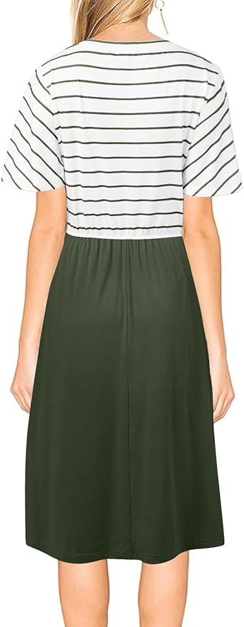 Unique Design: Short sleeves, Crew neck, stripes t-shirt top with solid color bottom, elastic waist, about knee length.