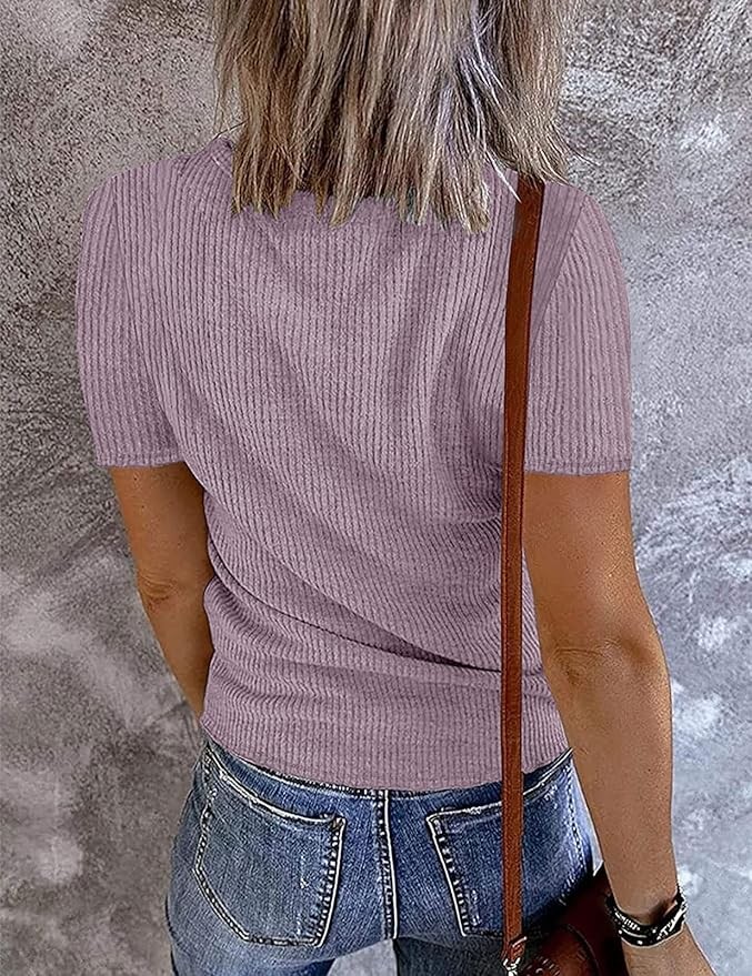 The summer basic short sleeve solid color top looks simple but cute. The ribbed knit material will make you look slim, and the buttons and V-neck will make you look sexy. It's super easy to wear and looks classy with jeans and sneakers.