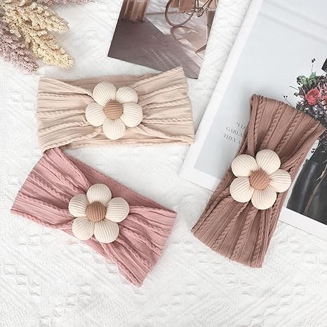 MIUXUESO 3 Pcs Baby Flower Headbands Baby Girls Nylon Headbands Soft Hairbands Hair Accessories for Newborn Infant Toddler Kids(Beige Pink Khaki)