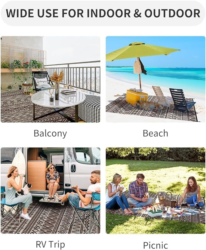 • Waterproof&Quick Dry: Easy clean, waterproof and quick dry recycled outdoor plastic straw rug. Dirt, hair and spill can be easily removed by water spraying or shaking. Perfect choices to be put outdoors all the time like outdoor patio rug, balcony rug or outdoor pool rug. Also a sand free waterproof beach mat, outdoor camping rug, picnic mat or rv outdoor rugs.