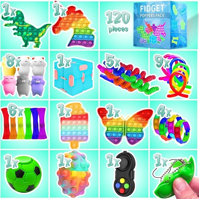• PACK OF 120: 4 Pop Bubble, 1 Flip Chain, 8 Mochi Squishies, 9 Stretchy String Fidgets, 6 Mesh and Marble Sensory Toys, 1 Fidget Pad, 1 Snake Cube Twist, 1 Tracks Fidget, 1 Infinity Cube, 1 Soccer Ball, 1 Puzzle Box, 4 Sensory Rings, 1 Squeeze Soybean, 4 Pop Bracelets, 20 Pop Rings, 21 Mini Pop Bubble, 1 Pop Ball, 10 Stickers, 8 Spiky Balls, 8 Foam Putty, 6 Pop Tubes and 4 Fidget Spinners.