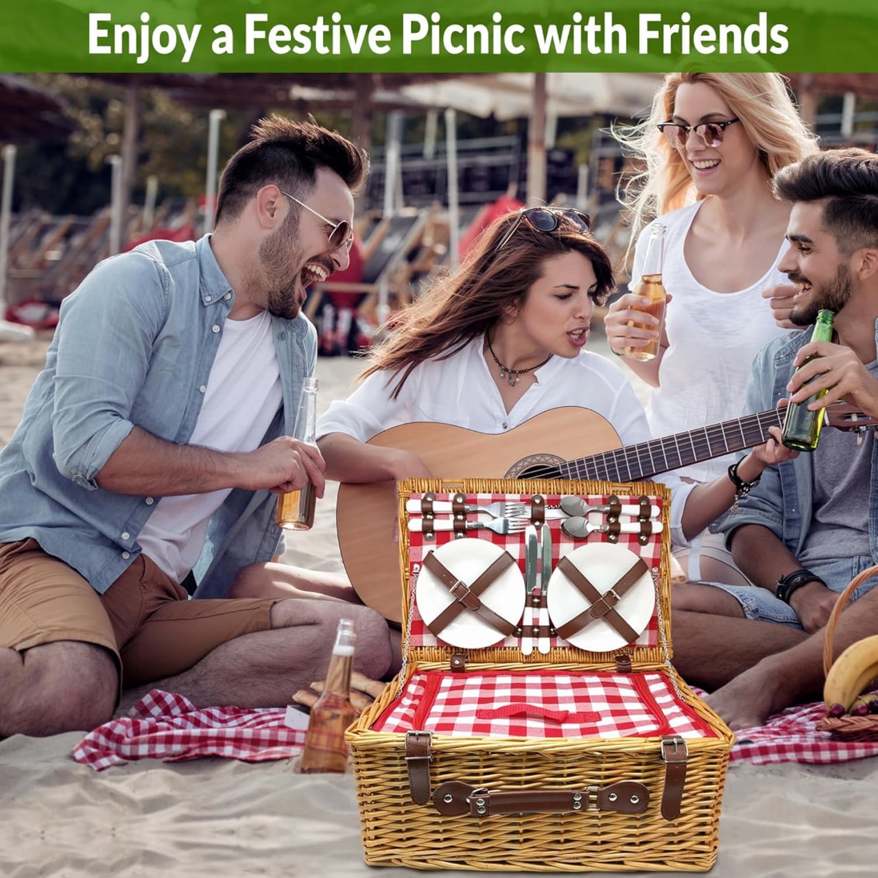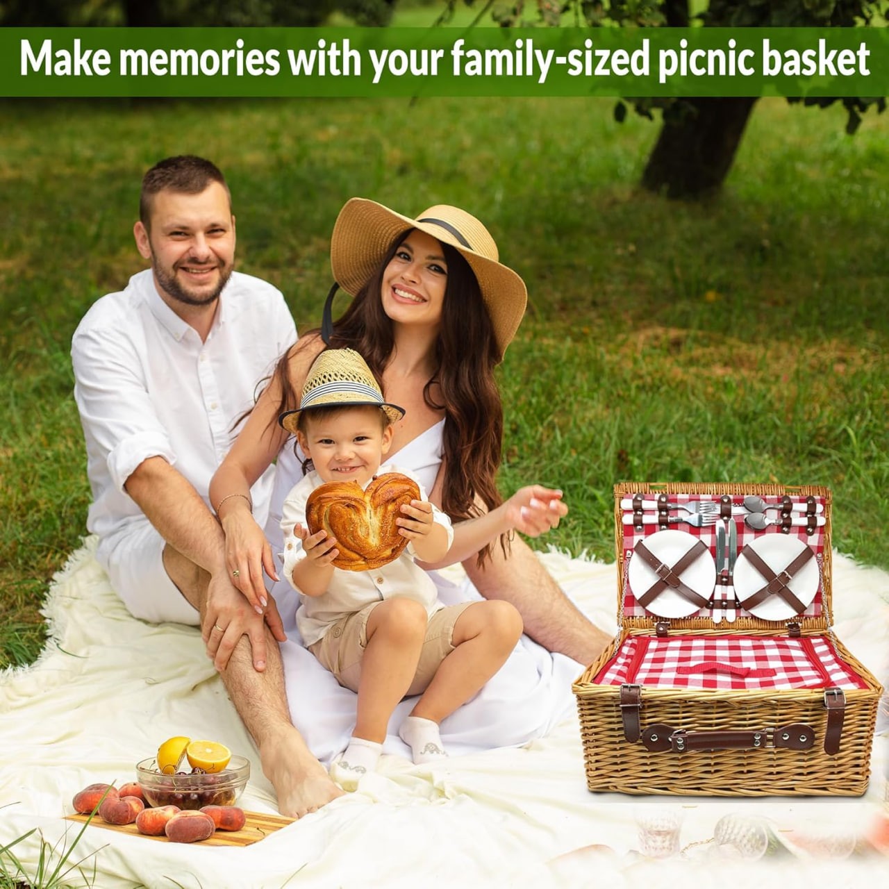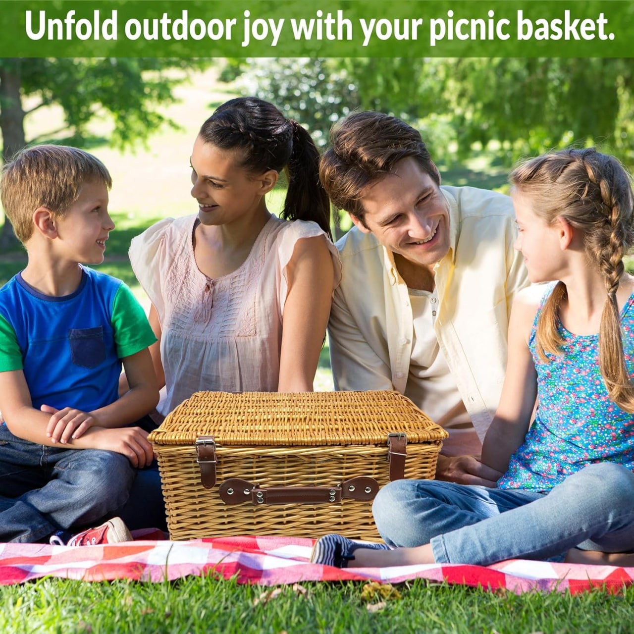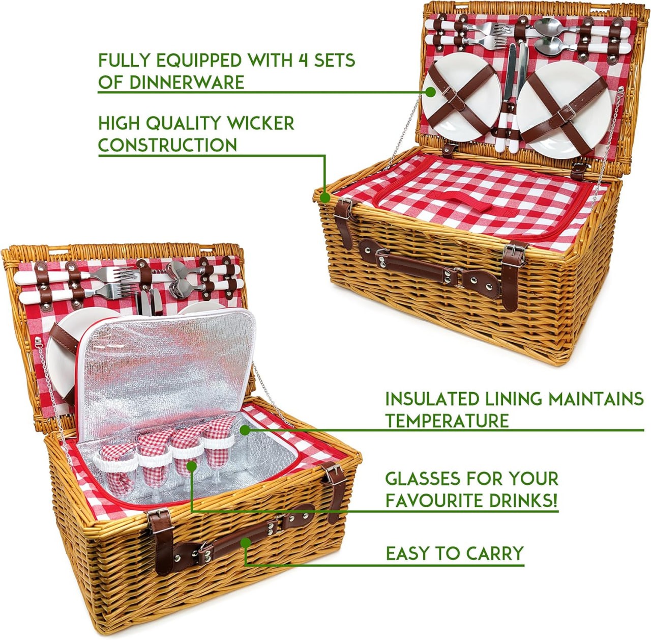 Complete Picnic Set for Four: Enjoy an outdoor feast with our deluxe picnic basket set, complete with 4 wine glasses and 4 sets of dinnerware; The sturdy handle of our wicker basket makes it easy to carry anywhere!