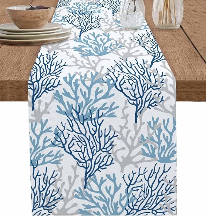 Navy Blue Coral Coastal Cotton Linen Rectangle Table Runners 13"x36", Summer Beach Seaside Nautical Coffee Table Runner Dresser Scarves Luxury Table Runners for Wedding Party Banquet Dinner Decor