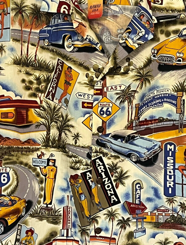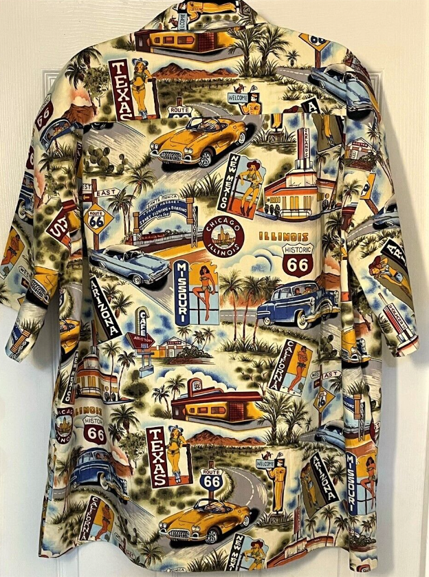 This new with original tag PACIFIC LEGEND  Route 66 Hawaiian Shirt is constructed of a cotton print of all of the Route 66 travel destinations accompanied by pin-up girls and cars!  Very colorful and graphic!  In excellent condition - new with tags.  Does have one spot on the front that might be a bit of color bleed - or it might be in the print.  Just thought i'd mention.  It is at the bottom left off the the "historic 66" sign.  Coconut buttons, single pocket, straight bottom.