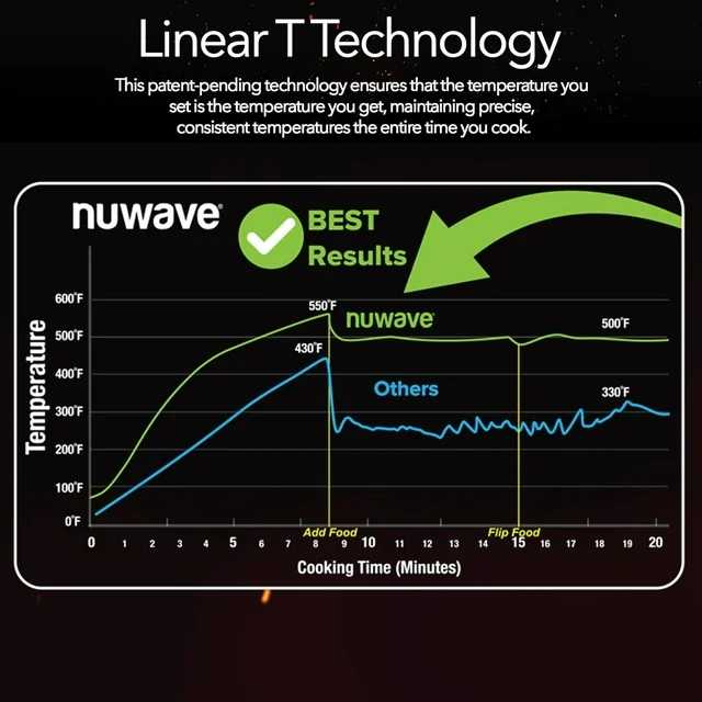 Fast Preheating: Little to no preheating time, from frozen to golden in minutes! Create gourmet meals with the versatility of a temperature range of 50°F to 500°F adjustable in precise 5°F increments for customized dual zone surround cooking.