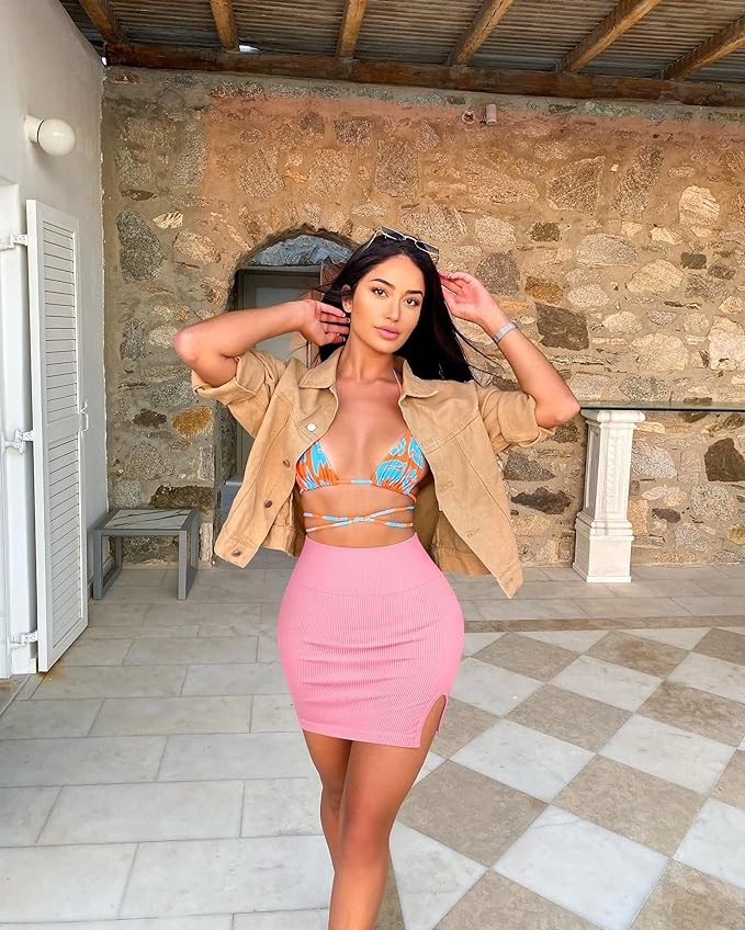 OQQ Women's 2 Piece Skirts Basic Casual Versatile Stretchy Ribbed Split High Waist Mini Skirt