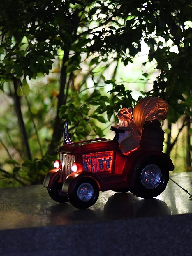 Outdoor Solar Powered Lighted Squirrel's Farm Tractor Statue Used in Lawn Garden Decor, Yard, Flower-Pool Christmas and Harvest Decoration