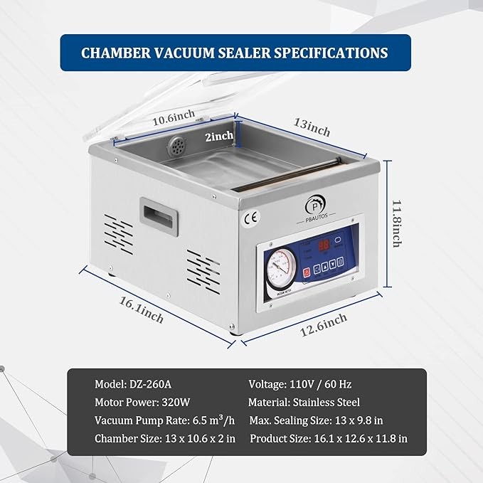 P PBAUTOS Chamber Vacuum Sealer Machine, with Micro Computer Control, DZ260A 110V/60Hz Food Packaging Sealer Machine with 6.5CBM/h Pump Rate, Applied in Home Kitchen and Commercial Use