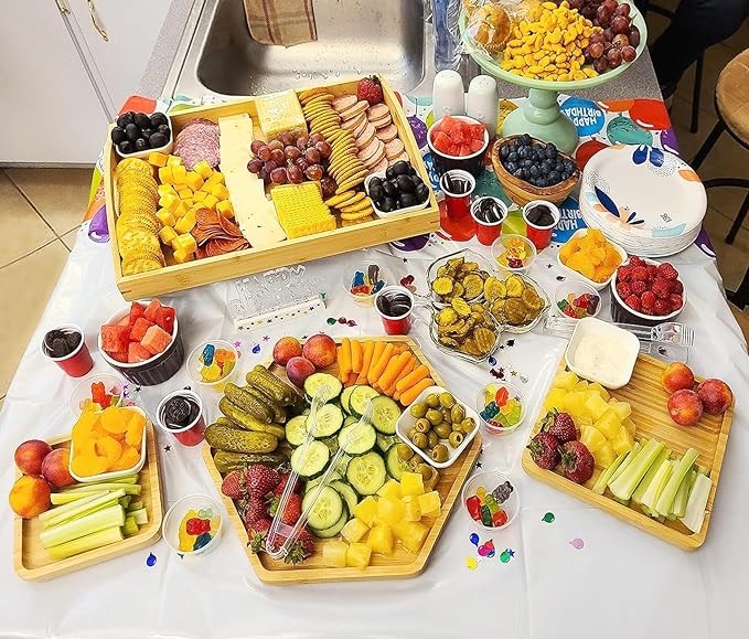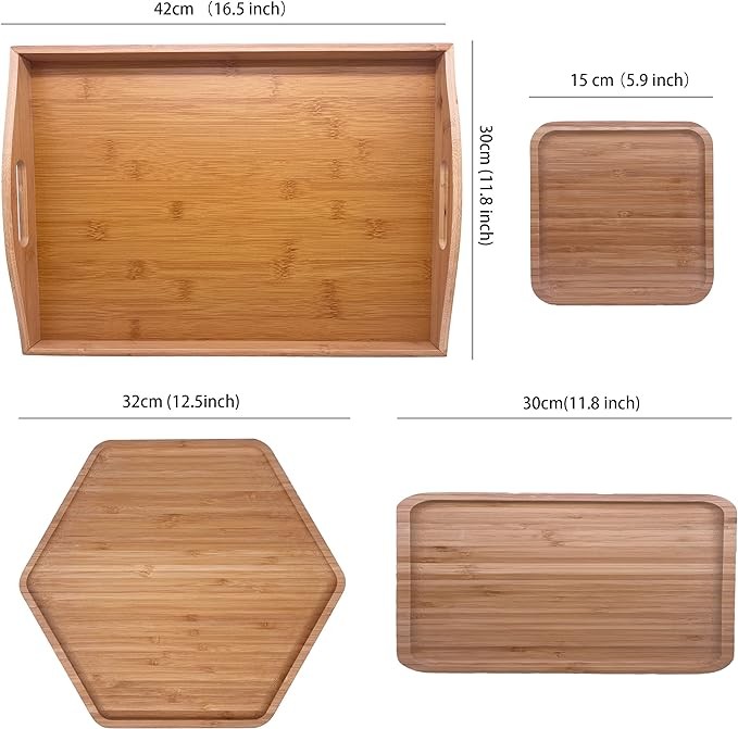 PAFREWOG Bamboo Serving Trays 16.5"x11.8"(42x30cm with Handle, Set Includes 1xHexagon 12.5"(32cm)+1xRectangle 9.8"(25cm)*5.9"(15cm)+1xSquare 5.9"(15cm) Dinner Plates Cheese Cutting Board