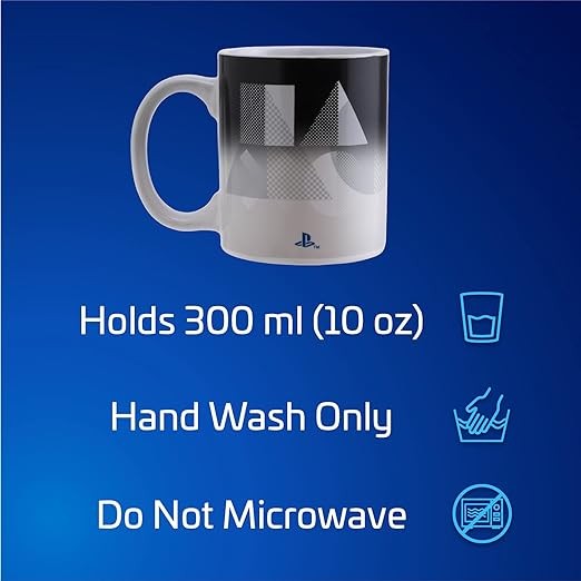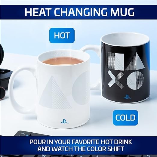 • Heat Change Mug: Enjoy refreshment while gaming with this Playstation 5 heat change mug. Simply add a hot drink to see the iconic Playstation buttons appear while the color shifts