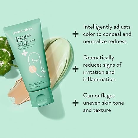 Peach Slices Redness Relief Color Correcting Moisturizer instantly conceals and corrects redness while deeply moisturizing and calming skin. Clean Color Correcting Technology intelligently adjusts color to leave red, irritated skin looking even, and smoot