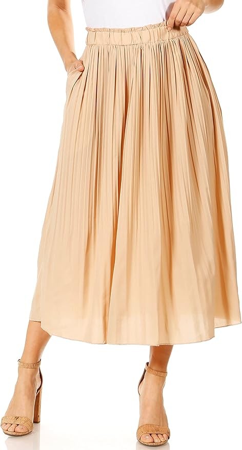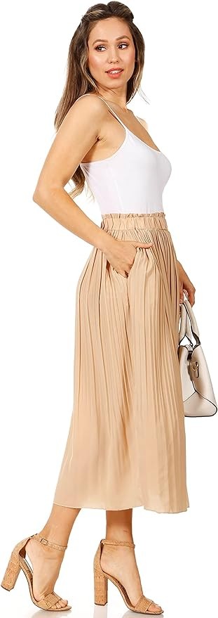 • STYLE - Featuring a high waisted fit, chic pleated style and 2 side pockets, the midi skirt is the ideal piece your closet needs. The elastic waistband gives great stretch, and the in seam side pockets are great for carrying small items. The aline style falls to an elegant hem that hits at midcalf length.