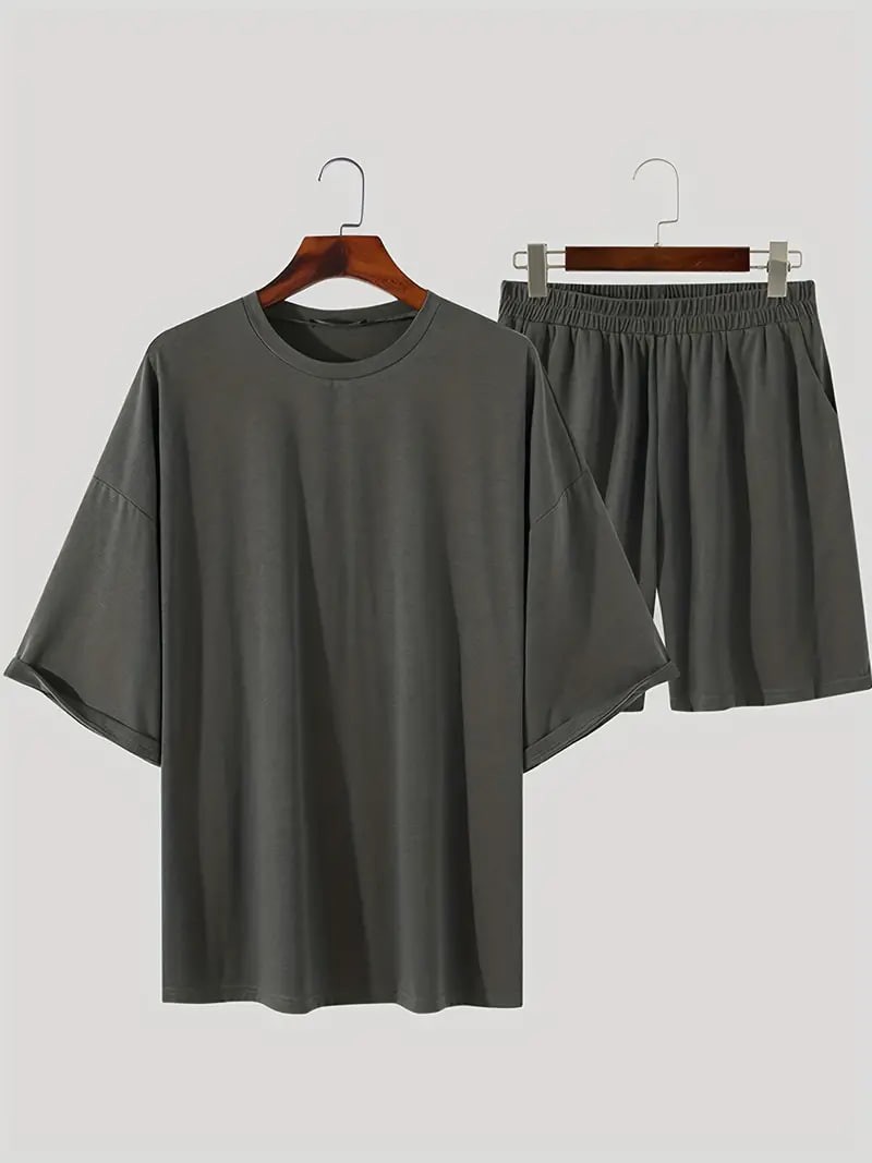 Plus Size,Men's Trendy Solid Crew Neck Short Sleeve T-shirt & Loose Shorts With Pockets Home Pajamas Sets, Casual Sets For Summer