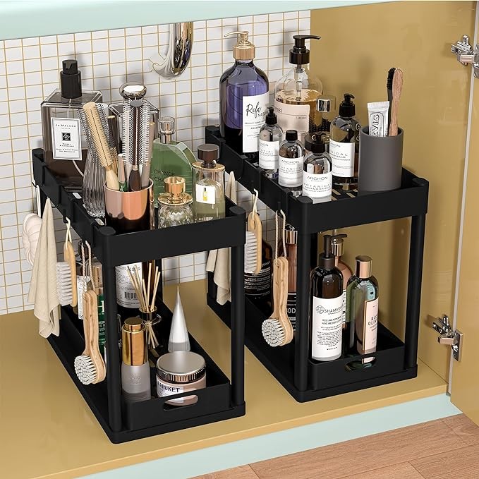 POUGNY 2PC Under Sink Organizer Rack 2 Tier Under Sliding Cabinet Basket Organizer Drawer with 4 Hooks, Multi-purpose Under Sink Storage for Bathroom Kitchen Desktop(Black)