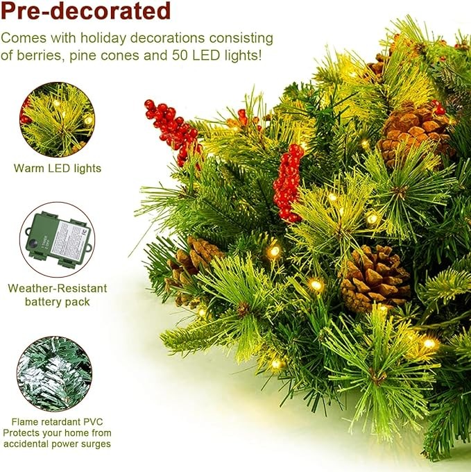 ?【Battery Operated Wreath with Timer】Equipped with 100 LED warm lights in total, the Christmas wreath with lights is powered by 3 AA batteries (batteries not included), press the on/off button once, the wreath will light up and activate the timer function, which will automatically turn on for 6 hours and off for 18 hours every 24 hours.