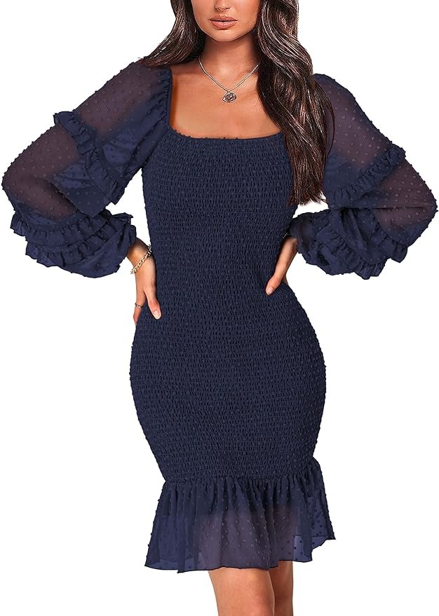 • DETAILS: Bodycon Dress With Square Neck Accentuates Your Feminine Charm. Puff Sleeve, Swiss Dot And Ruffle Hemline Of The Short Dress Create A Stylish And Playful Look. Smocked Design Makes The Going Out Dress Full Of Elastic And Suits For Various Body Shapes
