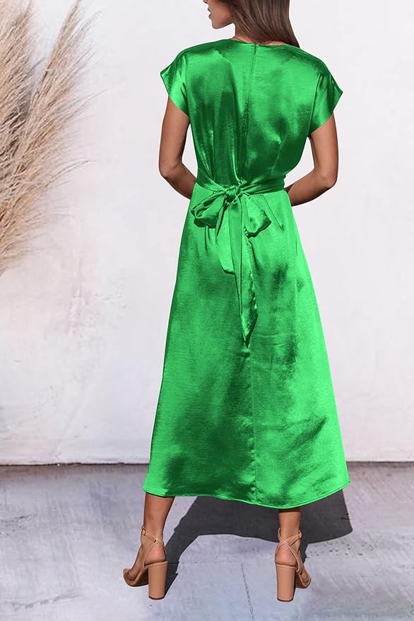 TRENDY DESIGN: Cap Sleeve Midi Dress For Women/Satin Dress For Women/Crewneck Swing Dress For Women/Belted Silk Dress For Women/Casual Flowy Dress For Women/High Waist A-Line Dress For Women/Summer Dress For Women 2023/Ruffle Dress For Women/Party Dress For Women/Wedding Guest Dress For Women