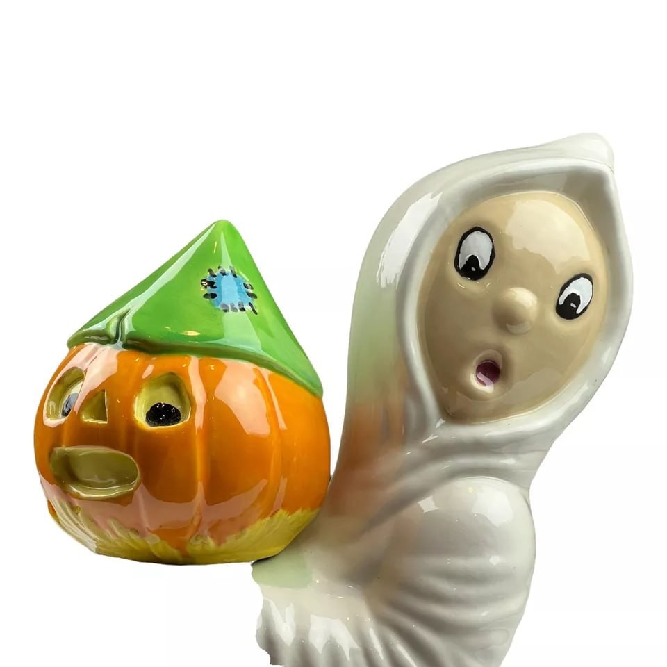 Vintage 12" Ceramic Ghost Holding Pumpkin/Jack O Lantern Head Halloween.