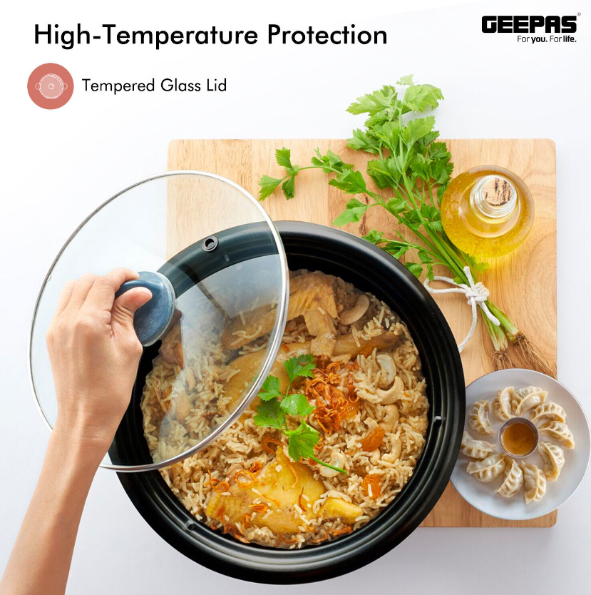 TEMPERED GLASS LID - This rice cooker has a sturdy lid made from tempered glass. It has a stainless steel rim that fixes it into place. It does not get smoky and lets you watch your rice as they are being cooked.
