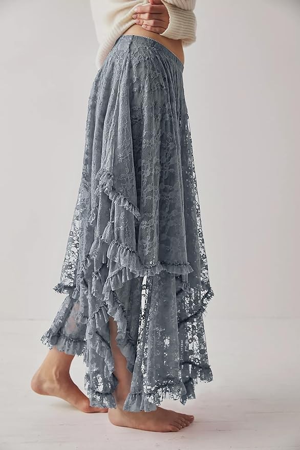 • FEATURES: Women's Handkerchief Hem Skirt. Can be worn as a Cover Up Skirt. It has Elastic Design at waist, Frill and Ruffle Detail, Romantic Lace Print, Irregular Layered Hem and Maxi Length.