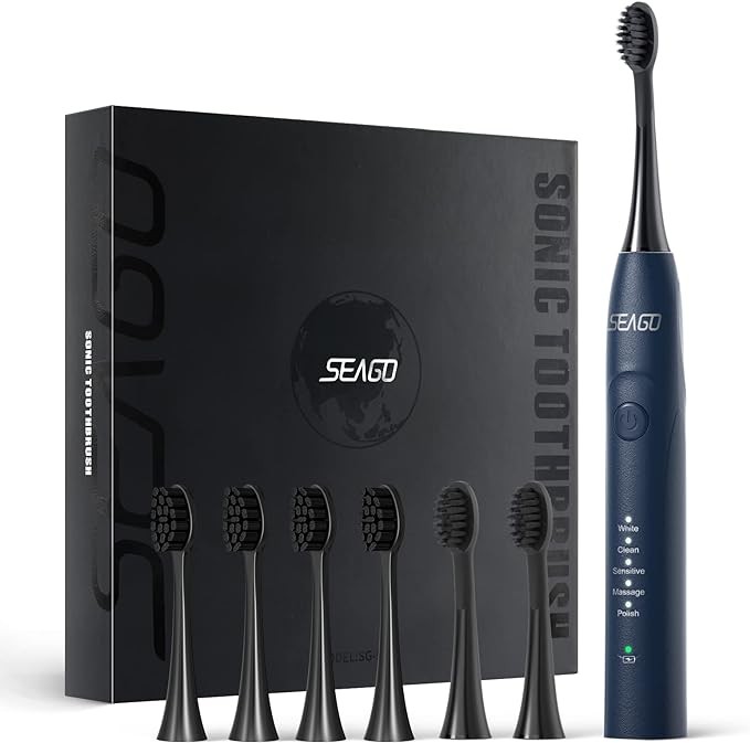 SEAGO Electric Toothbrush, Rechargeable Sonic Toothbrush Last for 30 Days with 5 Modes and 2 Mins Timer, Portable Electric Toothbrushes for Adults with 8 PCS Brush Heads (Blue)