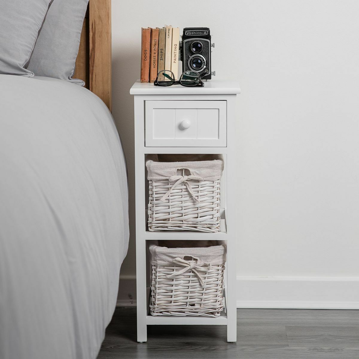 Shabby Chic Bedside Unit Tables Drawers Cabinet + Wicker Storage Wooden Bedroom