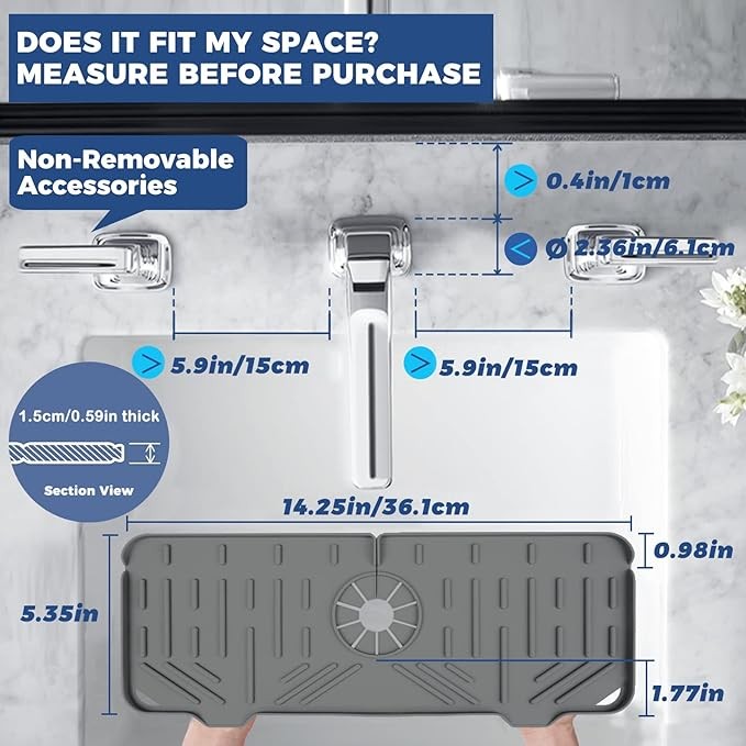 • That there must be no obstructions within a length of at least 5.9 inches on the left and right sides of the faucet. Otherwise there is not enough space to put silicone faucet handle drip catcher tray.