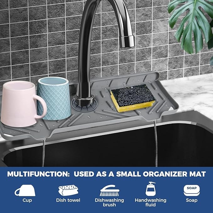 • ?【MORE ORGANIZATION】 It's not only a faucet drying mat, it also a sponge holder for kitchen sink, dish soap tray, dish drying mat, kitchen organization, home organizer. For kitchen: put sponge, dish soap, detergent, brush, and bottle on it. Upgrade the size of the increase, you can put more kitchen supplies. Make your sink cleaner. Used as an organizer mat, drain pad. It is a super practical home, bathroom, kitchen gadgets, house rv life apartment must haves!